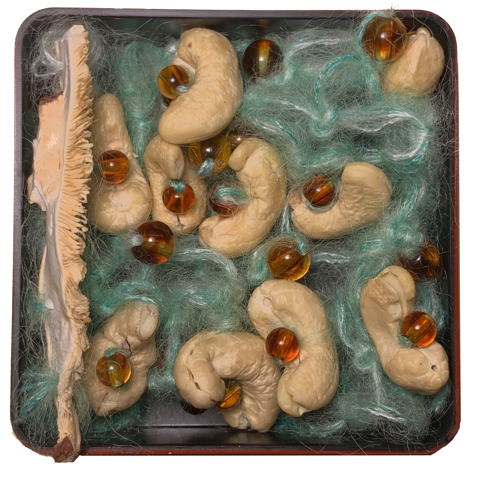 Mohair, cashew, plastic beads, shitake mushrooms, lacquer bento boxA needle going through the nut,